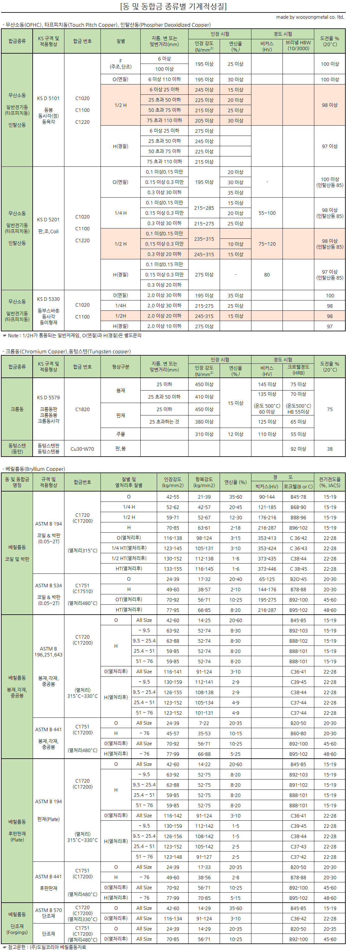 *동(전기동,무산소동,인탈산동), 크롬동,베릴륨동의 기계적 성질 입니다.