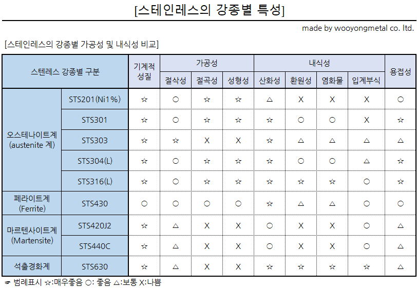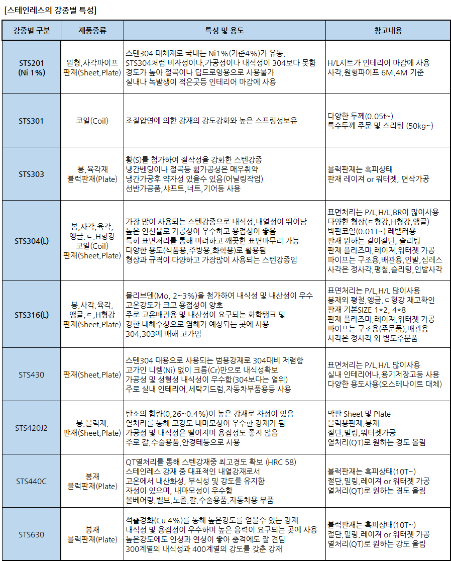 대표적인 스테인레스 STS303,304,316L 외 다양한 강종별 특성들에 대한 내용입니다. 홈피에 나와 있는 자료입니다. 퍼가기는 사랑입니다. ^^(사용하실때는 출처를 알려주세요.)