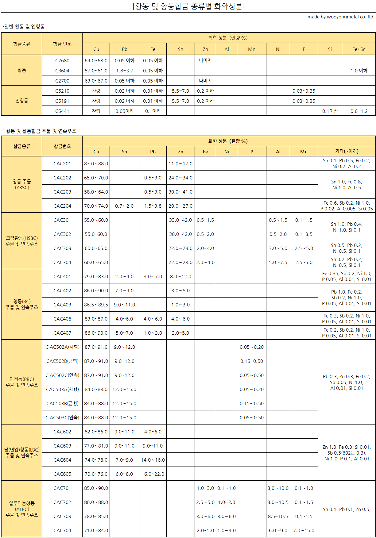 대표적 황동 및 황동합금의 화학성분표입니다.